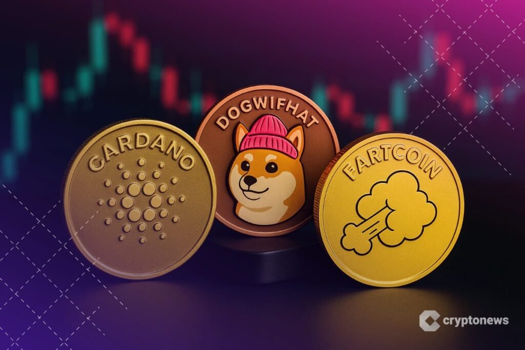 Three tokens stand out in this cycle: Cardano, Dogwifhat, and Fartcoin. Each reflects a different strand of the current rotation, blending utility, speculation, and liquidity in a cautious market.