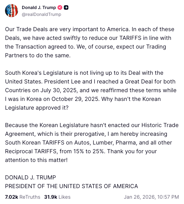 Trump posted on Truth Social that the “South Korean’s legislature is not living up to its deal with the United States,” announcing the tariff hike in response.